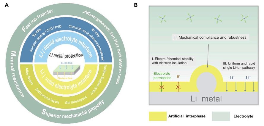 鋰金屬電池(LMBs)具有顯著優于傳統鋰離子電池的高能量密度,但由于鋰負極超高化學反應活性,幾乎會與所有的非水性液體電解質形成固態電解質界面(SEI),這種極度不穩定的SEI嚴重限制了LMB的應用。科研人員通常采取電解質添加劑、鋰鹽和溶劑優化、高濃度電解質和納米結構電解質等提高SEI的穩定性。但是在長期服役過程中,SEI仍然存在許多不足:化學異質性,機械脆性,不同工況條件下的成分與結構差異等。合理設計穩定的界面,為實現安全穩定的金屬鋰負極應用提供重要保障。