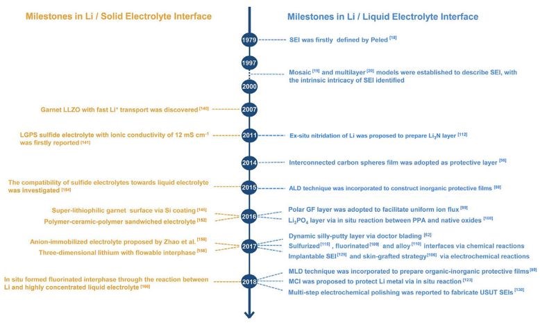 圖2 鋰金屬負極與液態(固態)電解質之間界面工程的發展史