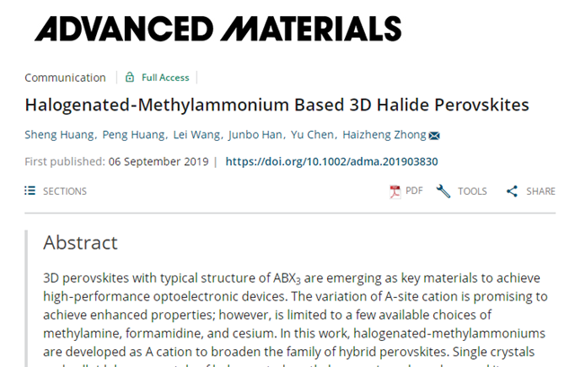 近日,北京理工大學(xué)材料學(xué)院鐘海政課題組在鈣鈦礦材料A位分子的設(shè)計和制備方面取得突破進(jìn)展,于2019年9月6日在材料領(lǐng)域的頂級期刊《Advanced Materials》上在線發(fā)表, Halogenated-Methylammonium Based 3D Halide Perovskites,  Advanced Materials  2019, 31, 1903830 (https://onlinelibrary.wiley.com/doi/10.1002/adma.201903830)。論文發(fā)表后很快獲得“納米人”等學(xué)術(shù)媒體關(guān)注和報道。