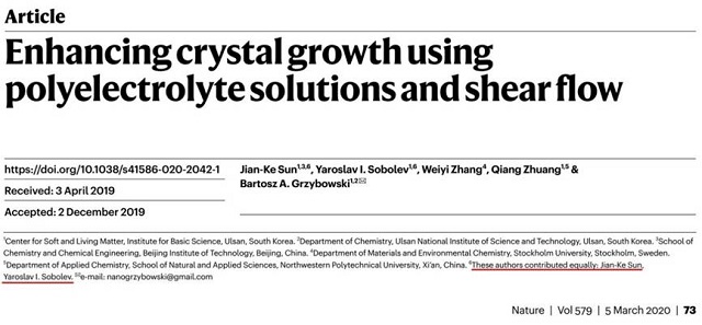近日,北京理工大學化學與化工學院孫建科教授以《Enhancing crystal growth using polyelectrolyte solutions and shear flow》為題,將其“剪切促進晶體生長”研究成果發表于《Nature》雜志上(Nature 2020, 579, 73-79)。孫建科為該論文的共同第一作者,化學與化工學院為共同合作單位,排名第三。此研究是與韓國基礎科學研究院Bartosz Grzybowski 教授合作完成。
