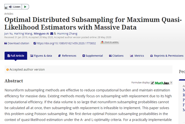 日前,北京理工大學數學與統計學院虞俊助理教授及其合作者在統計學四大國際頂級期刊《Journal of the American Statistical Association》上發表了題為“Optimal Distributed Subsampling for Maximum Quasi-Likelihood Estimators with Massive Data”的研究論文。該論文針對如何從分布式存儲海量數據中提取有用的信息這一問題,從基于最優試驗設計理論的抽樣角度提出了一個快速解決方案。