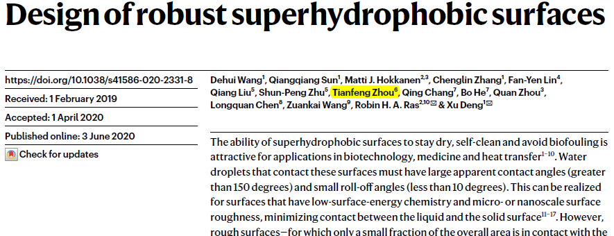 6月3日,《Nature》正式刊發(fā)了北京理工大學(xué)周天豐教授與電子科技大學(xué)鄧旭教授團(tuán)隊(duì)和芬蘭阿爾托大學(xué)Robin H. A. Ras教授的研究成果“Design of robust superhydrophobic surfaces”,并被選為當(dāng)期封面。該論文提出去耦合機(jī)制將表面浸潤(rùn)性和機(jī)械穩(wěn)定性拆分至兩種不同的結(jié)構(gòu)尺度,通過在兩個(gè)結(jié)構(gòu)尺度上分別進(jìn)行最優(yōu)設(shè)計(jì),為超疏水表面創(chuàng)造出具有優(yōu)良機(jī)械穩(wěn)定性的微結(jié)構(gòu)“鎧甲”,解決了超疏水表面機(jī)械穩(wěn)定性不足的關(guān)鍵問題。
