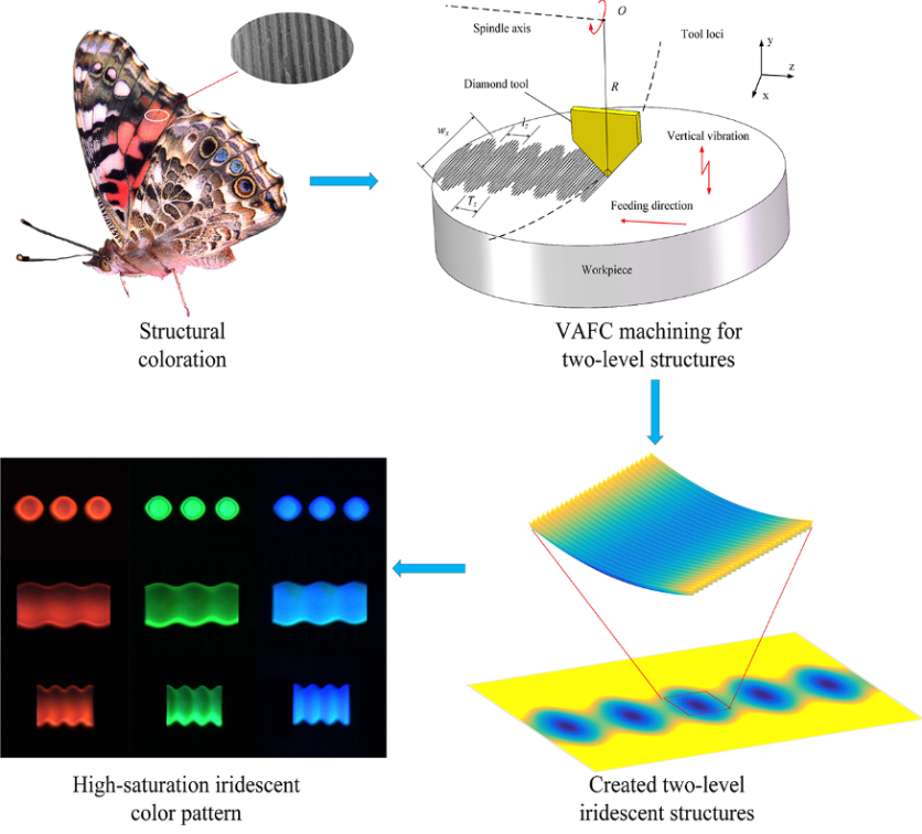 該研究成果中,周天豐團(tuán)隊(duì)設(shè)計(jì)制造了微溝槽組成的衍射光柵微納兩級(jí)結(jié)構(gòu),建立了兩級(jí)結(jié)構(gòu)形狀與衍射顏色的映射關(guān)系,并通過編碼可以直接誘導(dǎo)出虹彩圖案。團(tuán)隊(duì)首次提出了變頻振動(dòng)輔助飛刀切削加工(VAFC)方法,開發(fā)了VAFC試驗(yàn)平臺(tái),通過數(shù)值模擬仿真優(yōu)化加工參數(shù),實(shí)現(xiàn)了具有高飽和度和均勻性的兩級(jí)虹彩結(jié)構(gòu)高效超精密制造。該微納兩級(jí)結(jié)構(gòu)有望在多色印刷,微顯示器/投影儀,商標(biāo)防偽,隱形隱身方面得到應(yīng)用。