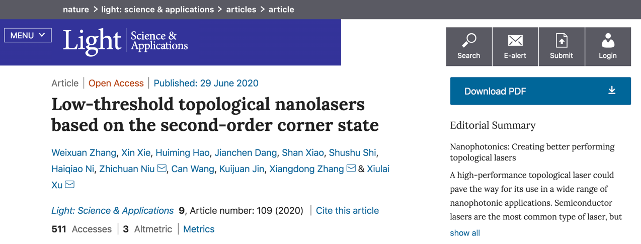 拓?fù)鋵W(xué)關(guān)注的是物體在連續(xù)形變下所保持的全局不變的性質(zhì)。將拓?fù)鋵W(xué)的思想引入到光學(xué)微納結(jié)構(gòu)的設(shè)計(jì),對(duì)實(shí)現(xiàn)魯棒性的光場(chǎng)調(diào)控具有重要的意義,如實(shí)現(xiàn)背散射免疫的電磁波傳輸?shù)取W罱陨泻7ㄑ芯克难芯咳藛T及其合作者利用拓?fù)浔Wo(hù)的邊界態(tài)構(gòu)造了閉合環(huán)形腔,并利用該環(huán)形腔實(shí)現(xiàn)了激光效應(yīng),即所謂的拓?fù)浼す?Science 359, eaar4003; eaar4005 (2018))。相比于傳統(tǒng)激光器,基于拓?fù)溥吘墤B(tài)的激光器在外界無(wú)序擾動(dòng)的情況下,具有能量損耗低,激光發(fā)射效率高等優(yōu)勢(shì)。然而,目前所設(shè)計(jì)的拓?fù)浼す馄鞒叽巛^大,閾值高,通常需要幾毫瓦的泵浦才能產(chǎn)生激光效應(yīng)。進(jìn)一步實(shí)現(xiàn)低閾值的納腔激光,對(duì)實(shí)現(xiàn)高效可集成的拓?fù)涔庠淳哂兄匾囊饬x。
