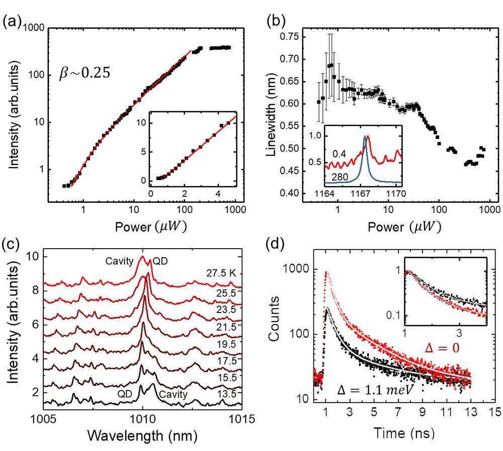 圖(2)(a,b)拓?fù)浼す狻M負(fù)浣菓B(tài)熒光強(qiáng)度(a)和線寬(b)隨激發(fā)功率的變化。閾值約為1μW。(c,d)單個(gè)量子點(diǎn)與拓?fù)浣菓B(tài)的弱耦合。(c)不同溫度下的熒光光譜。當(dāng)量子點(diǎn)(QD)與腔共振時(shí),熒光強(qiáng)度增強(qiáng)約4倍。(d)共振(紅色)與非共振(黑色)狀態(tài)下的熒光衰減曲線。共振時(shí)的衰減速率約為非共振時(shí)的1.3倍