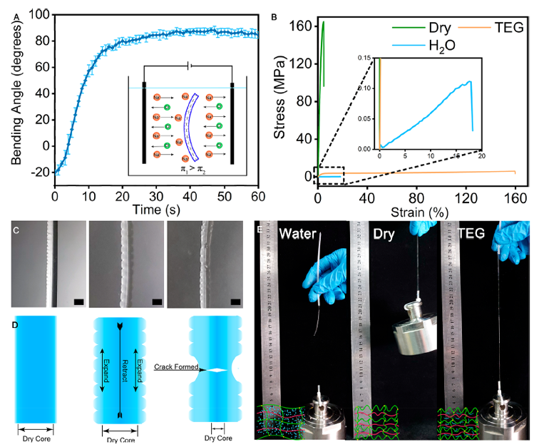 然而此纖維機械強度依舊不足以支持進一步的加工與應用。因此,作者將水凝膠纖維置于三甘醇中對其進行了溶劑置換,在此過程中,水凝膠纖維中的水分子被移除,帶來機械強度提高,同時少量三甘醇進入到凝膠網絡中,相較簡單干燥的干膠纖維,三甘醇置換所得的凝膠網絡得以維持一定柔韌性。