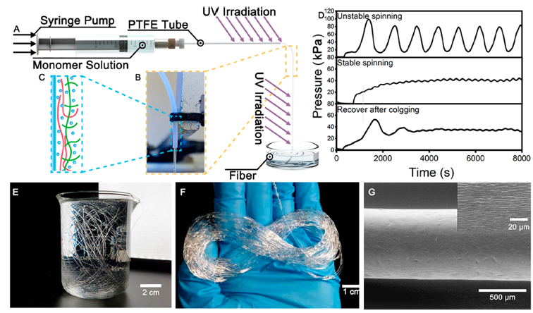 圖2. 自潤滑紡絲方法與水凝膠纖維表征