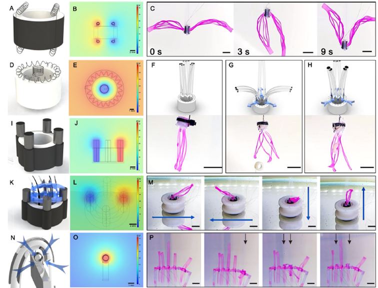 最后,作者利用COMSOL有限元模擬輔助進行了電極的設計,將電極與編織結構相結合,制造出了一系列水下仿生軟體機器人。