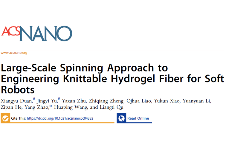 近日,北京理工大學化學與化工學院趙揚特別研究員與合作者在水凝膠紡絲與軟體機器人方向取得重要進展。研究成果以“Large-Scale Spinning Approach to Engineering Knittable Hydrogel Fiber for Soft Robots”為題,于10月19日在線發表于ACS Nano,論文鏈接為https://pubs.acs.org/doi/10.1021/acsnano.0c04382。北京理工大學化學與化工學院本科生段翔宇與于靜怡為共同第一作者,北京理工大學化學與化工學院趙揚特別研究員為通訊作者。北京理工大學為第一通訊單位。