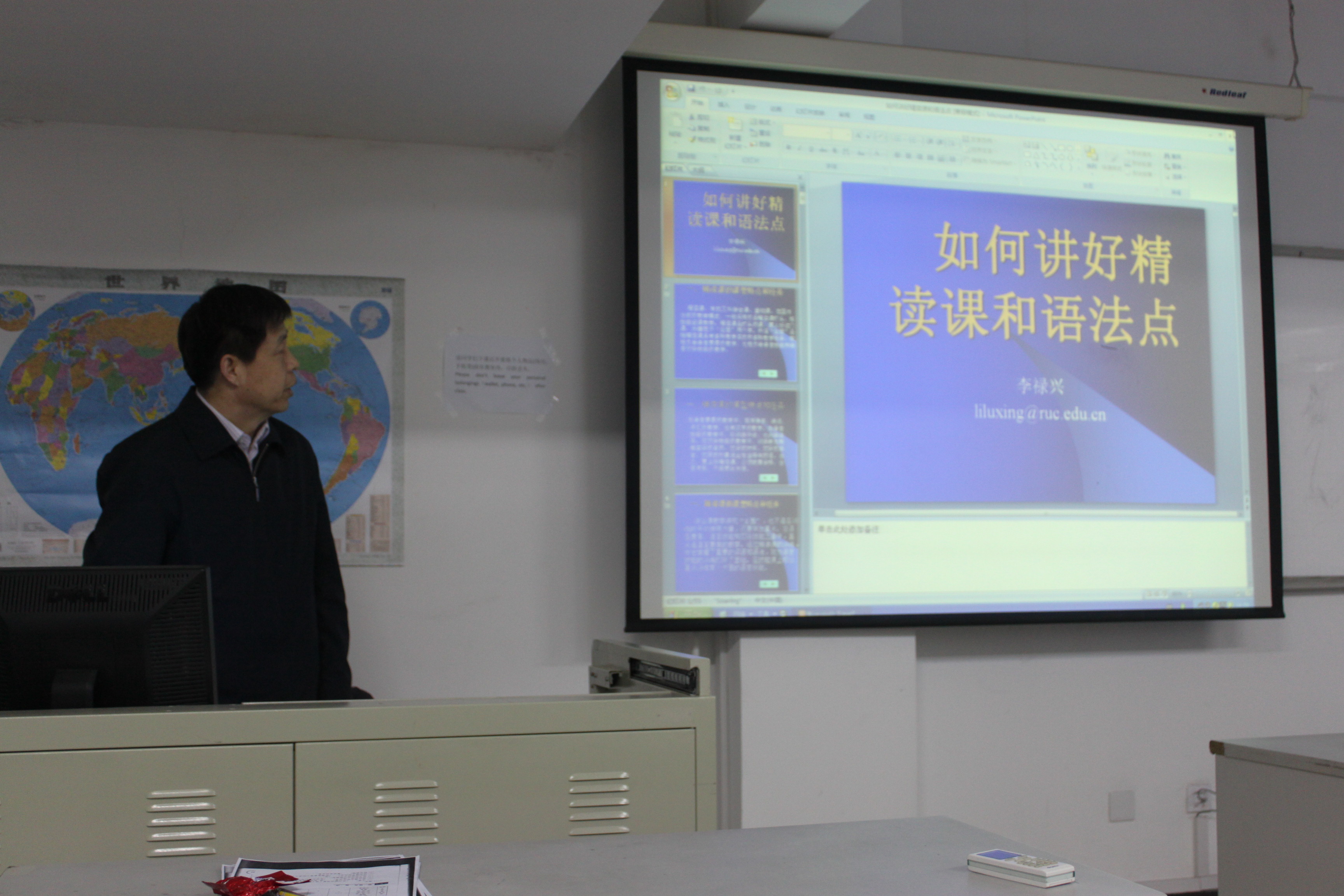 李祿興副教授從精讀課的課型特點及任務(wù)說起,依次闡述了精讀課的分塊設(shè)計、重點生詞和語法點的選取、語法點的講解以及精讀課課文的處理四個方面的內(nèi)容。他緊密結(jié)合實際教學(xué)案例,深入剖析對對外漢語精讀課教學(xué),旁征博引,談吐幽默,贏得在場老師的陣陣掌聲。在講座的互動環(huán)節(jié)中,李副教授與在場教師就口語教學(xué)、聽力教學(xué)等問題進(jìn)行了熱烈的討論。李副教授的講座內(nèi)容豐富,信息量大,在場教師從中受益匪淺。