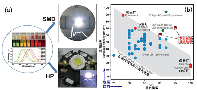 圖1. (a)北理工所制備的納米晶熒光粉材料及所制備的白光LED器件;(b)北理工所制備納米晶白光LED性能與文獻中現有白光照明技術參數的對比,紅旗所在點為北理工2013年報道數據,其他數據來自Nature Photonics, 2013, 7, 13-23綜述。