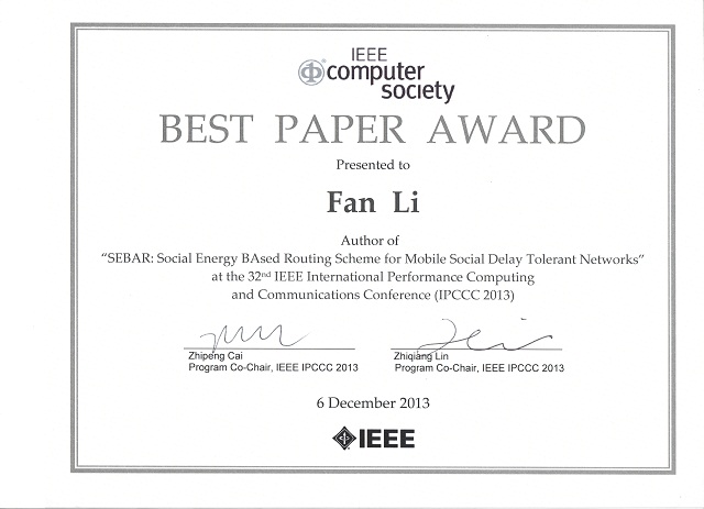 2013年12月在美國圣地亞哥舉行的第32屆IEEE國際性能計算和通信會議(IEEE International Performance, Computing and Communications Conference, IEEE IPCCC 2013)上,計算機學院李凡副教授及其團隊的論文' SEBAR: Social Energy BAsed Routing Scheme for Mobile Social Delay Tolerant Networks '在126篇投稿中獲得本次會議唯一最佳論文獎。此項榮譽是李凡老師及其研究團隊長期努力的結果,是對該團隊研究與學術水平的肯定。