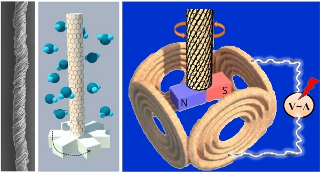 圖示:螺旋石墨烯纖維在濕度改變下帶動磁鐵旋轉產生電能