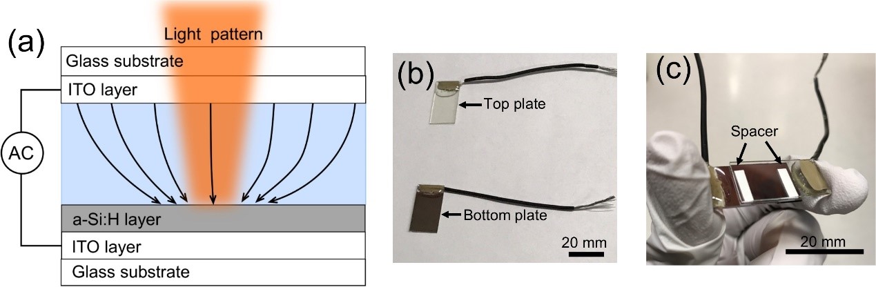 圖2為光電鑷的技術原理圖與光電鑷芯片的實物圖。光電鑷芯片一般由兩塊ITO導電玻璃基板組成,底板上鍍一層光致導電層a-Si:H(氫化非晶硅)。將含有納米/微米物體的溶液轉移到光電鑷芯片的腔室中后,施加交流電和光斑,光電鑷器件就會在光斑的誘導下產生非均勻電場。非均勻電場與納米/微米物體相互作用可以產生介電泳力,從而控制納米/微米物體的空間位置。光電鑷是一種利用半導體材料的光電效應將光場與電場結合在一起的微納操控技術,它具有如可編程性好、靈活性高、多功能性強、高通量和易于與其他表征系統集成等優勢,是一種非常先進的光操控技術。