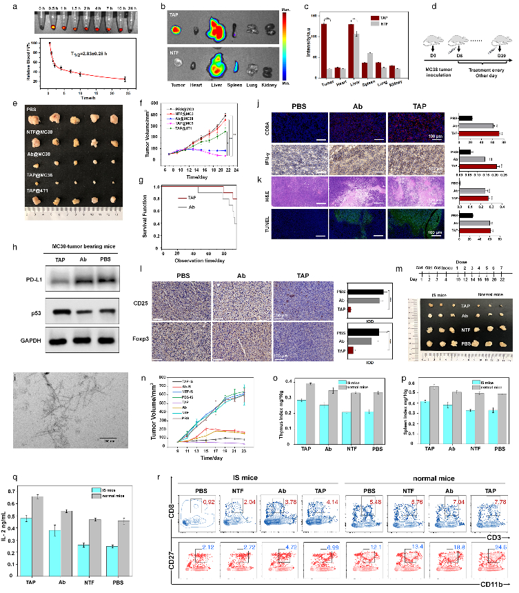 在正常小鼠及免疫抑制小鼠水平上,證實了TAP能特異性的靶向腫瘤組織,并展示出優于抗體的抗腫瘤效果。