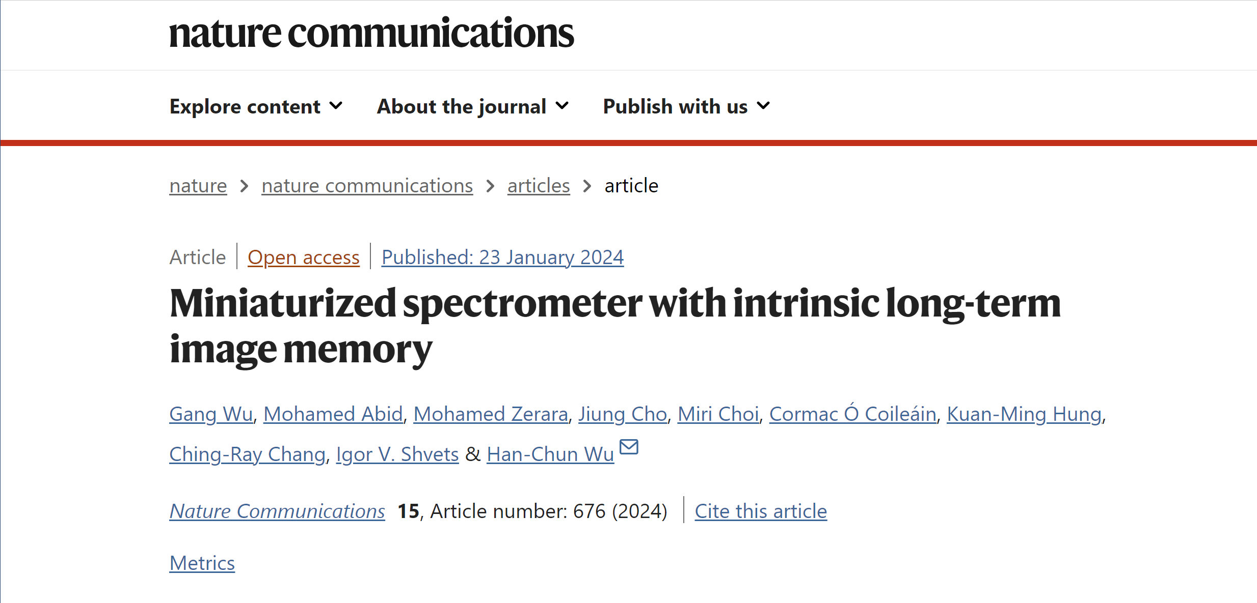 文章信息(*為通訊作者):Gang Wu, Mohamed Abid, Mohamed Zerara, Jiung Cho, Miri Choi, Cormac ó Coileáin, Kuan-Ming Hung, Ching-Ray Chang, Igor V. Shvets and Han-Chun Wu*,“Miniaturized spectrometer with intrinsic long-term image memory”, Nature Communications 15, 676 (2024).