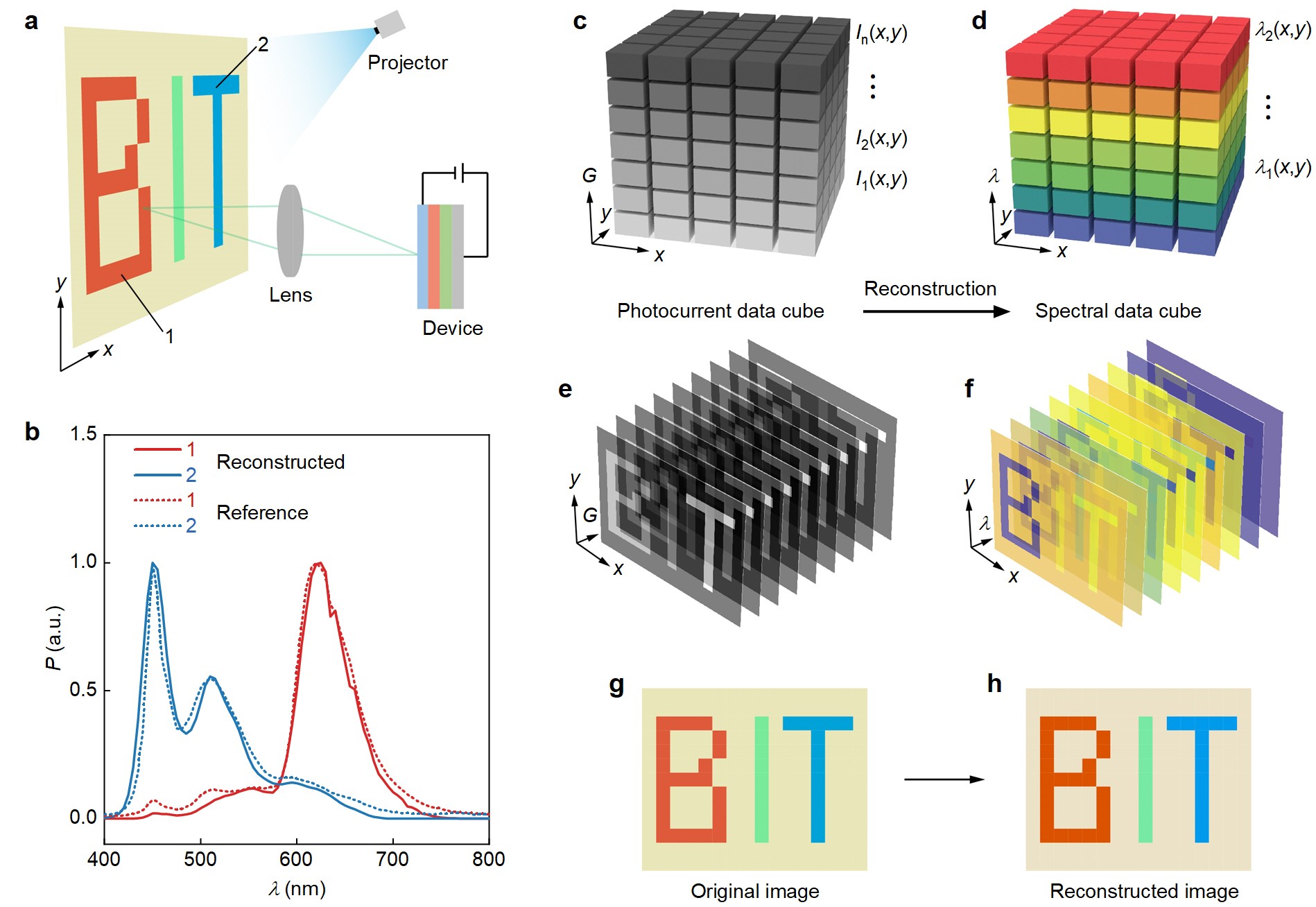 光譜儀在科學研究和工業應用中發揮著重要的作用。然而,傳統的光譜儀由眾多復雜光學器件構成,體積大。此外,傳統微型光譜儀采用馮·諾依曼架構,其光譜傳感、存儲和處理模塊在空間上分離,從而增加了光譜儀的能耗,降低了信號處理速度。基于此,我們跨國際與跨領域的合作團隊提出了使用單個SnS2/ReSe2范德華異質結來構造微型光譜儀,通過界面局域態的光柵壓效應和光電存儲效應使該范德華異質結在可見光譜范圍內具有光電探測、光譜重構和光譜成像的功能。更重要的是,通過交替施加激光脈沖和柵極脈沖,結合計算機算法和壓縮感知技術使所構筑的微型光譜儀不僅可用作圖像存儲器,還具有信號處理能力,為設計超越馮·諾依曼架構的光譜儀邁出了重要一步。