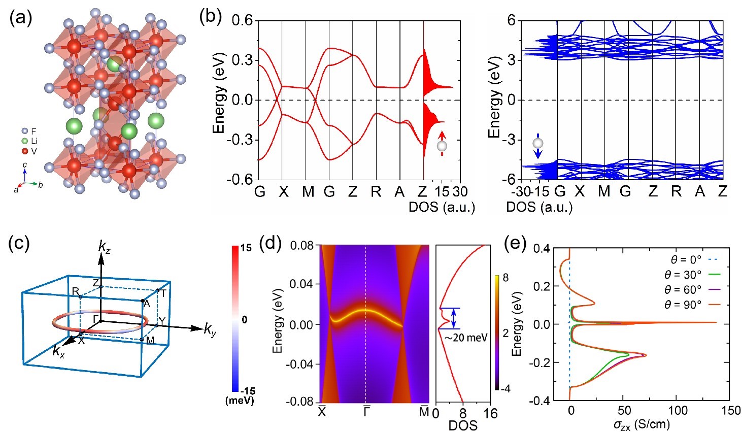 圖2: (a)為LiV2F6的晶體結構;圖(b)為LiV2F6的自旋極化能帶圖和態密度圖;圖(c)為位于 kz ="0的三維節線輪廓圖;圖(d)為LiV2F6的[001]面的表面色散和態密度;圖(e)為在極角 θ  = 0°、30°、60°和90°時,本征反常霍爾電導σzx分布圖。