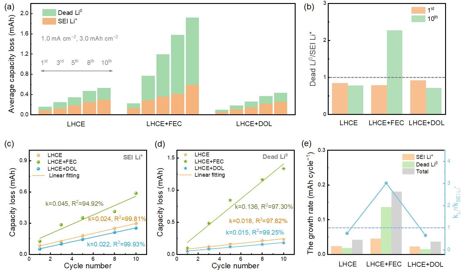 在傳統(tǒng)的認(rèn)知之上,本研究表明由于循環(huán)過程中鋰電極/電解液界面經(jīng)歷持續(xù)的動(dòng)態(tài)演化過程,因此非活性鋰損失的主導(dǎo)形式實(shí)際上取決于dead Li0和SEI Li+的相對(duì)增長(zhǎng)速率(kLi0/kSEI Li+)。當(dāng)采用典型的醚類/酯類柔性成膜添加劑調(diào)控原有富無機(jī)產(chǎn)物SEI之后,非活性鋰表現(xiàn)出不同的增長(zhǎng)行為。醚類成膜劑1,3-二氧戊環(huán)(DOL) 被發(fā)現(xiàn)有助于同時(shí)減小SEI Li+和dead Li0的增長(zhǎng)速率。