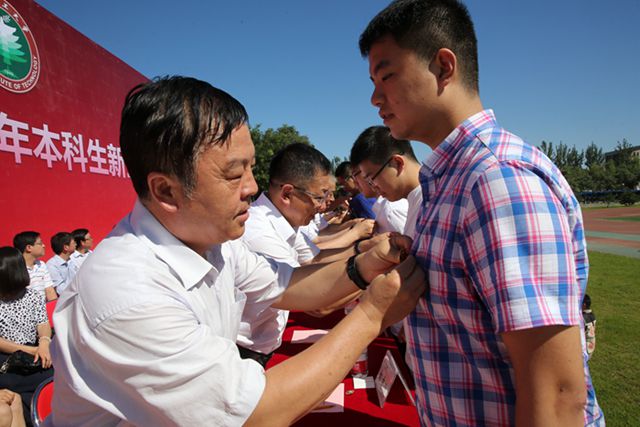 在渾厚的北京理工大學校歌聲中,主席臺領導和嘉賓為2016級本科生代表佩戴?;?,標志著2016級本科生已經正式成為北京理工大學的一員,從此刻起將與北京理工大學同呼吸、共命運,將用自己的激情和奮斗去抒寫人生新篇章。