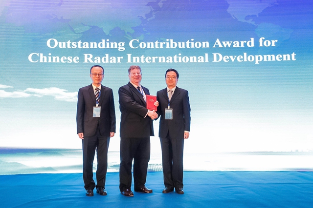開幕式致辭后,大會頒發(fā)了“中國雷達(dá)國際發(fā)展杰出貢獻(xiàn)獎”,由龍騰教授介紹Hugh Griffiths教授的獲獎理由,感謝其對中國雷達(dá)國際發(fā)展作出的巨大貢獻(xiàn),并由中國電子學(xué)會雷達(dá)分會主任委員吳劍旗教授為其頒獎。