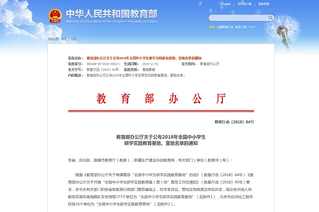 近日,教育部公布了2018年全國中小學生研學實踐教育基地、營地名單,北京理工大學光電創新教育實驗基地成功入選“全國中小學生研學實踐教育基地”。此項遴選推薦工作于6月開展,旨在貫徹落實黨的十九大精神,發展素質教育,進一步落實《教育部等11部門關于推進中小學生研學旅行的意見》,積極推動各地中小學生研學實踐教育活動深入開展。