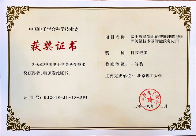 根據(jù)《中國電子學(xué)會科學(xué)技術(shù)獎(jiǎng)管理辦法》該獲獎(jiǎng)于2018年12月揭曉。本項(xiàng)目由北京理工大學(xué)、杭州中軟安人網(wǎng)絡(luò)通信股份有限公司、北京大學(xué)和復(fù)旦大學(xué)組成的科研團(tuán)隊(duì)在國家863計(jì)劃、973計(jì)劃等項(xiàng)目支持下,歷經(jīng)九年的產(chǎn)學(xué)研用聯(lián)合攻關(guān),在自然語言立體理解、一體化實(shí)體識別與關(guān)系抽取、多視角特征融合答案選擇、語義相似度計(jì)算模型和多領(lǐng)域知識圖譜自動構(gòu)建方面取得了重要技術(shù)突破,研制了高效精準(zhǔn)的智能政務(wù)服務(wù)機(jī)器人。