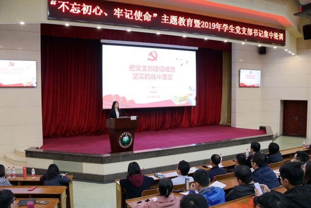 本次集中輪訓為期三天,共計24學時,包含理論學習、實踐培訓、小組討論和交流分享四個板塊。在“不忘初心、牢記使命”主題教育統一安排下,包麗穎結合學習調研成果講授專題黨課,主題為《把黨支部建設成為堅強戰斗堡壘》。她從為什么強調不忘初心、牢記使命,深刻體悟開展主題教育的意義等三個方面,為學生黨支部書記深入講解了開展“不忘初心、牢記使命”主題教育的重大意義。并就學生黨支部建設的重要性、現有的做法與成效、問題及挑戰以及加強學生黨支部建設的方法和路徑等四個方面進行了詳細闡述,加深了學生黨支部書記對學生黨建和學生黨支部工作重要性的認識和理解。她強調,面對新形勢新挑戰,學生黨支部書記需要準確把握學校改革發展的新任務新要求,進一步提高對高校學生黨建工作的認識,深刻認識自身肩負的光榮職責與使命,始終保持昂揚向上的精神狀態和永不懈怠的奮斗姿態,珍惜時代賦予的難得的發展機遇,為實現中華民族偉大復興的中國夢貢獻力量!