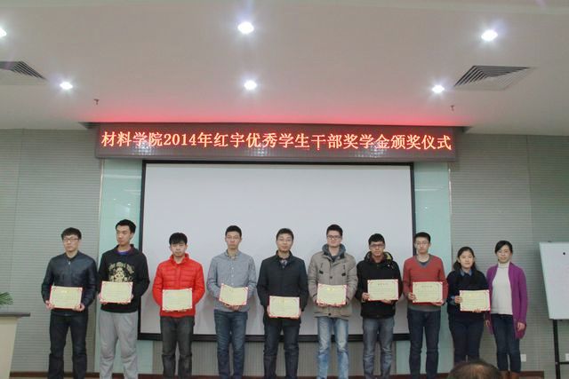 隨后,頒發了材料學院2014年度紅宇優秀學生干部獎學金。紅宇優秀學生干部獎學金是由重慶紅宇精密工業有限責任公司捐資設立,獎勵學習態度端正,工作能力強,在學習、日常行為和科研工作中起模范帶頭作用的學生干部。劉艷老師為獲得2014年度紅宇優秀學生干部獎學金的付海東等10名同學頒發了榮譽證書。