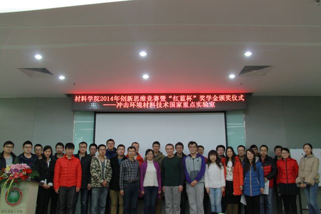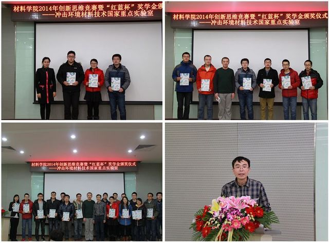 接下來,頒發了材料學院2014年度沖擊材料環境技術國家重點實驗室創新思維競賽獎。此項競賽是由材料學院沖擊材料環境技術國家重點實驗室主辦,鼓勵和支持廣大研究生、本科生同學了解和掌握材料科技前沿動態,鍛煉和增強個人科研素養和綜合素質,激發同學們的創新思維和拔尖意識,同時發揮重點實驗室高水平人才培養能力,引導同學們根據個人興趣和靈感,在重點實驗室開放式平臺上開展科研創新工作。