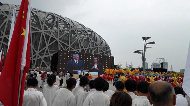 北京時間7月31日14點30分,來自北京理工大學的志愿者們與首都各崗位志愿者共計200人在惠新西街南口集合,坐上開往國家體育場的大巴車。滿車的志愿者,陽光,興奮,滿腔作為申冬奧慶祝活動一份子的自豪。志愿者到達現場后迅速投入到旗手的工作當中,揮動手中的旗幟,或鮮艷的國旗,或圣潔的申奧旗。與志愿者一起參與活動的,還有龍獅表演隊、腰鼓隊、空竹隊、太極扇隊等,場面非常宏大。
