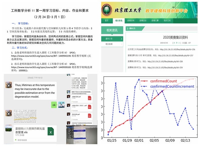 疫情期間,教師們學術研究不停歇,堅持做好學生科研學習指導工作。在2020年國家自然科學基金項目的申報工作中,已有25個項目提交了申請意向,數量相比去年有所增加,還有許多教師正在積極籌備中;數學建模基地及時調整美國大學生數學建模競賽的集訓形式,通過QQ群和科創平臺發布培訓資料供學生下載學習; 多個學術討論班改成線上方式,導師在提醒學生注重疫情防護的同時,開展日常科研指導工作;統計學系導師王典朋在線指導學生在畢業設計中利用數學模型研究疫情發展規律,啟發學生運用理論知識解決實際問題的能力。