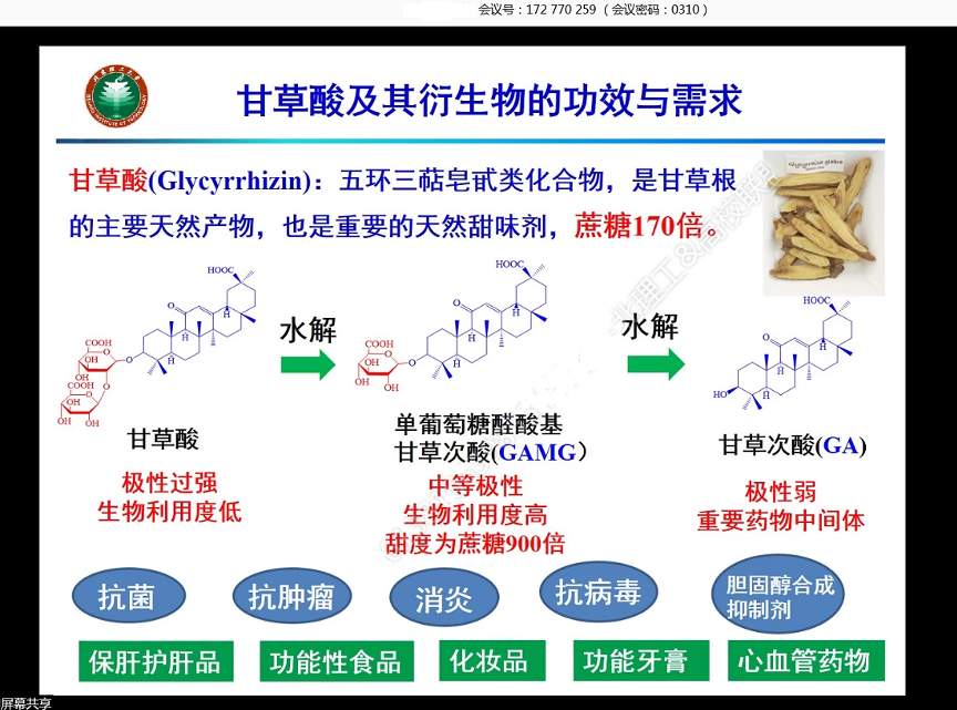 作為本次活動(dòng)承辦單位,北京理工大學(xué)推薦路演的兩個(gè)項(xiàng)目備受參會(huì)人員的廣泛關(guān)注。來自化學(xué)與化工學(xué)院李春教授團(tuán)隊(duì)的呂波特別研究員分享了“甘草酸衍生物分子模擬篩選與制備項(xiàng)目”的相關(guān)情況。該項(xiàng)目通過分子設(shè)計(jì)和理論計(jì)算,給出基于甘草酸及其衍生物的候選小分子藥物,可獲得防疫新型冠狀病毒侵染與減少炎癥風(fēng)暴的甘草酸結(jié)構(gòu)衍生物。課題組具有多年研究積累,目前正在與某重點(diǎn)醫(yī)藥企業(yè)合作實(shí)施中試擴(kuò)大,成果具有良好的轉(zhuǎn)化應(yīng)用前景。