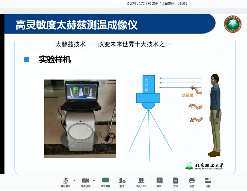 信息與電子學(xué)院博士生導(dǎo)師胡偉東分享了“高靈敏度太赫茲測(cè)溫成像儀項(xiàng)目”的相關(guān)情況。該項(xiàng)目采用太赫茲技術(shù),用于人體熱輻射量的測(cè)量,精度可達(dá)到0.1度,且能夠穿透衣物對(duì)人體表皮直接進(jìn)行溫度測(cè)量,可用于地鐵、客運(yùn)等人員密集公共場(chǎng)所的高效率精確測(cè)溫。該項(xiàng)目核心技術(shù)源于國家自然科學(xué)基金重大儀器項(xiàng)目和風(fēng)云四號(hào)氣象衛(wèi)星研制任務(wù),部分技術(shù)已經(jīng)在此次抗擊疫情中得到應(yīng)用。