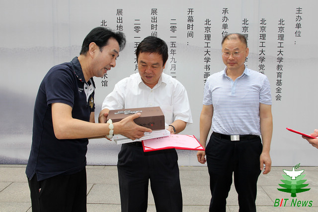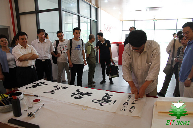 學校辦公室、黨委宣傳部、校友會辦公室、校團委、檔案館、圖書館、離退休工作處、人文學院、設計學院、國際教育學院和教育基金會辦公室負責人,離退休教師代表,學生代表參加書畫展開幕儀式。